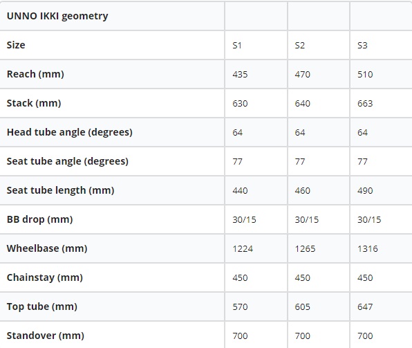 Z hľadiska geometrie sú na výber tri veľkosti rámu: S1, S2 a S3. Zatiaľ čo tabuľka geometrie IKKI nie je najagresívnejšia, UNNO uvádza, že akonáhle je sag na úrovni 35 %, e-bike je agresívny dostatočne.