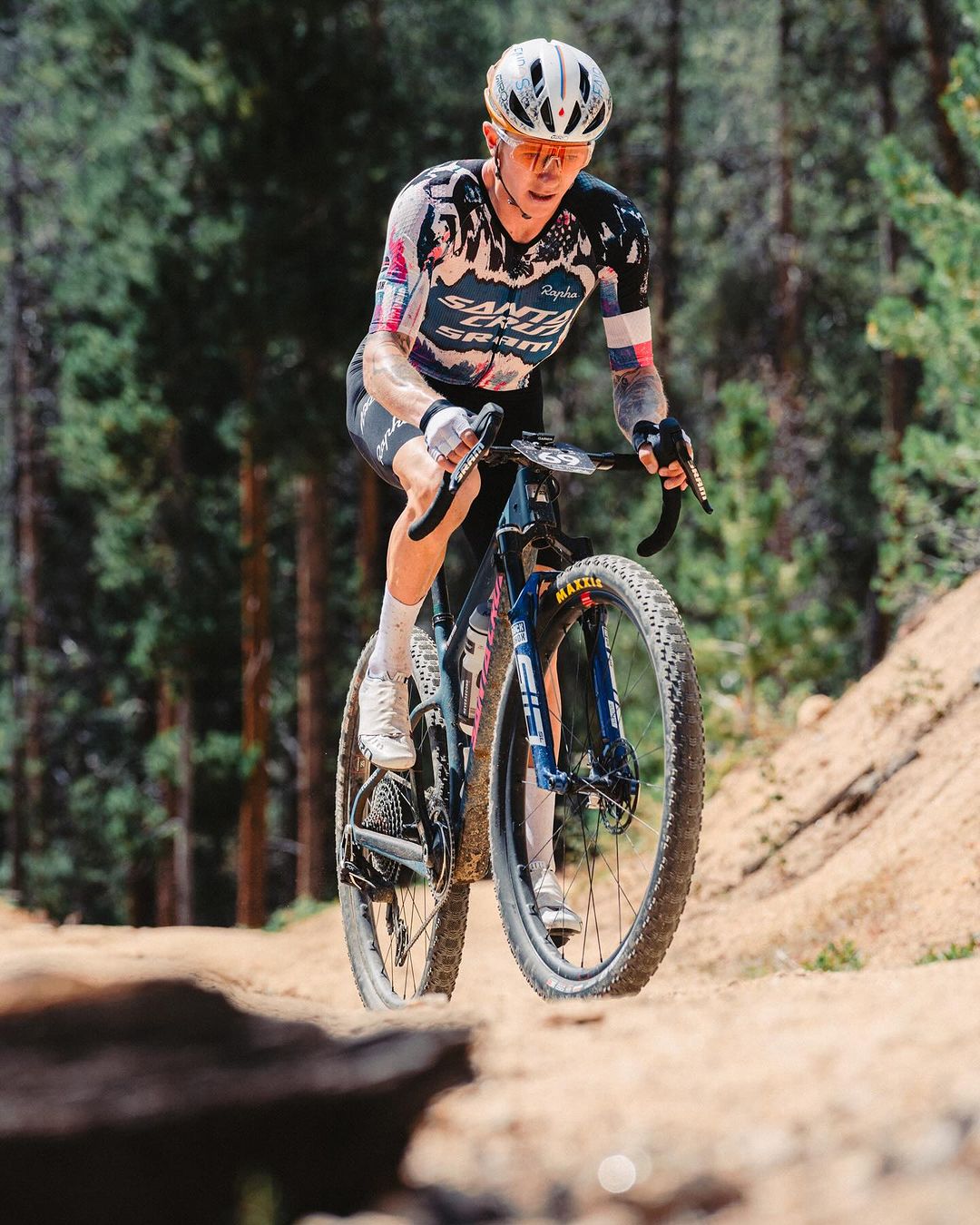 Američan pretekal na bicykli, ktorý mal vskutku zaujímavú špecifikáciu. Ako rám si zvolil karbónový horský hardtail Highball od Santa Cruzu s prevažnou väčšinou komponentov pre horské bicykle ako kolesá Reserve 28s s plášťami Maxxis Aspen ST 2.4″, radenie SRAM XX SL Transmission či 100 mm odpruženú vidlicu Sid Ultimate SL.