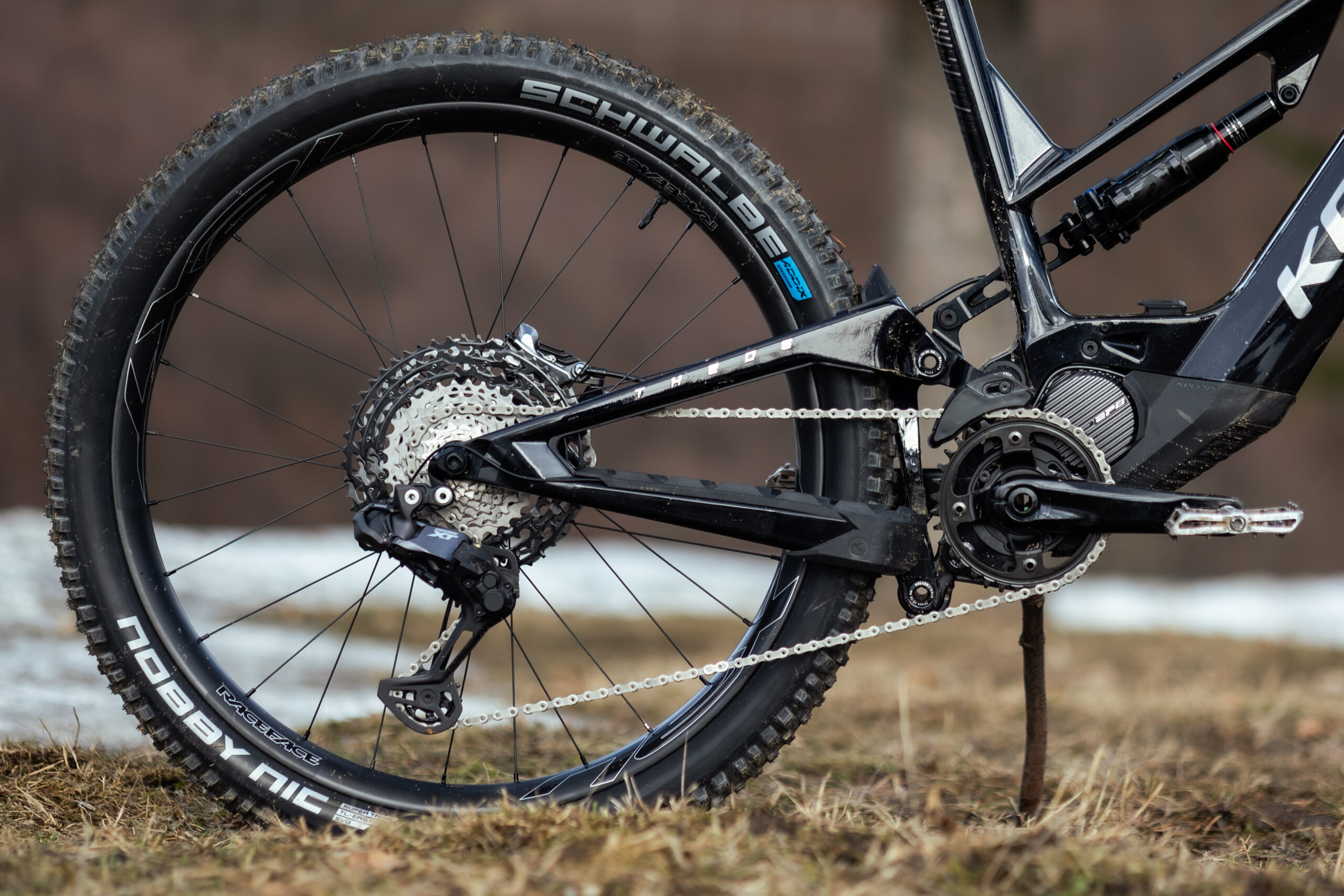 Karbónové kolesá Race Face Next R s mullet konfiguráciou sú obuté do plášťov Schwalbe Nobby Nic Evo Super Trail s najtvrdšou zmesou SpeedGrip. Kokpit tvoria karbónové riadidlá Race Face Next R, predstavec Turbine R.
