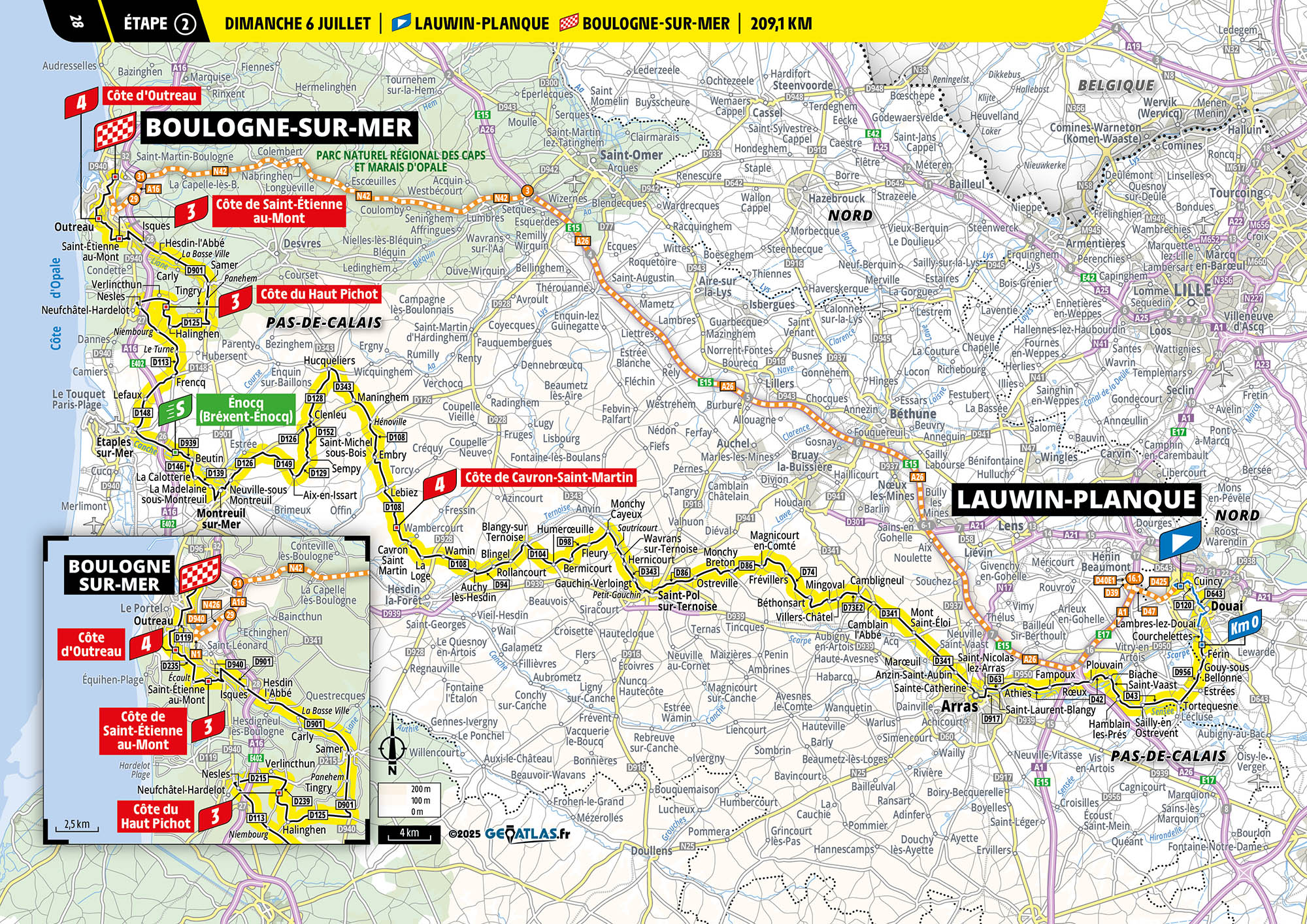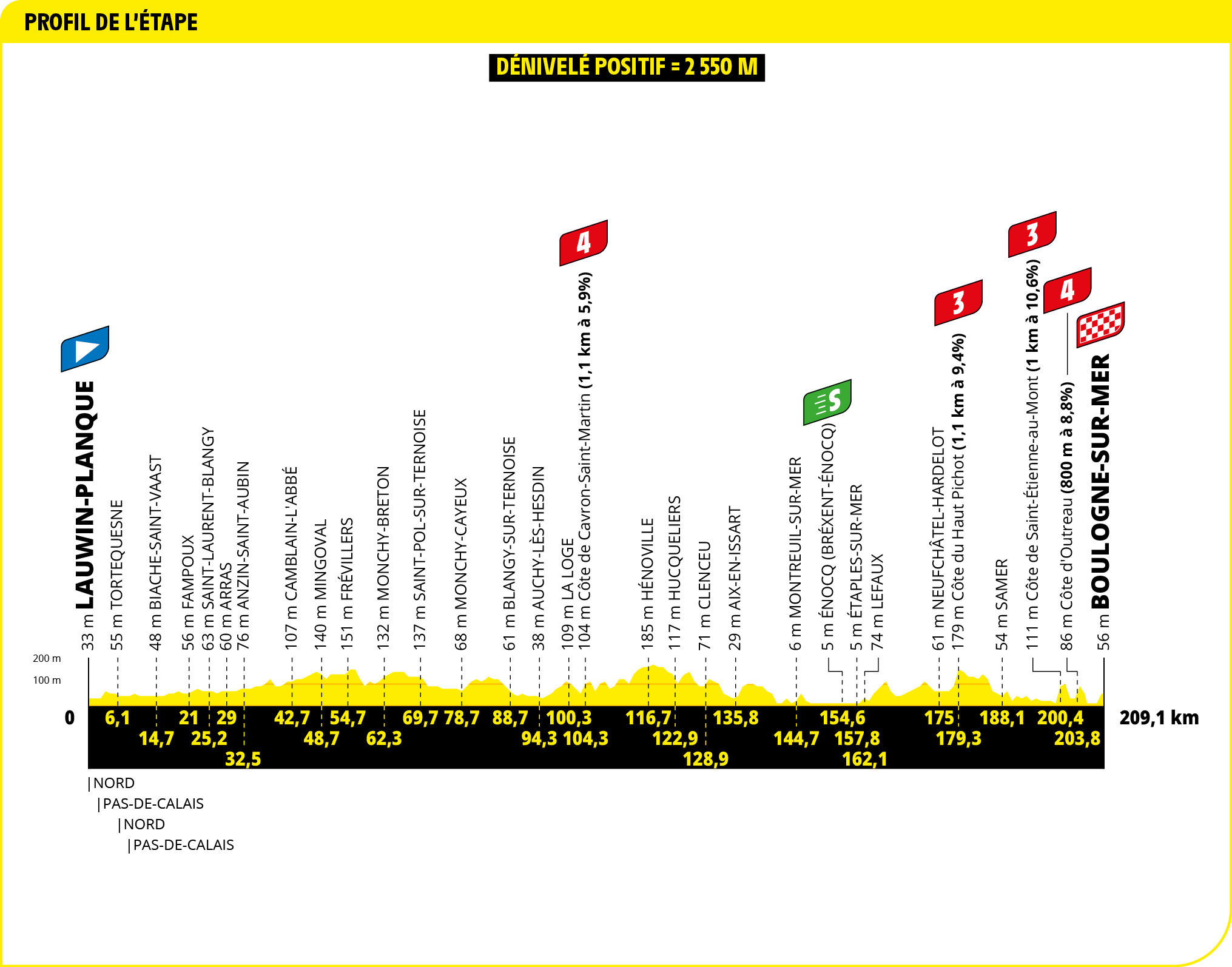 V posledných desiatich kilometroch pretekári zdolajú dve krátke, no prudké stúpania – Côte de Saint-Étienne-au-Mont (1 km / 10,6 %) a hneď po ňom Côte d’Outreau (800 metrov pri 8,8 %).