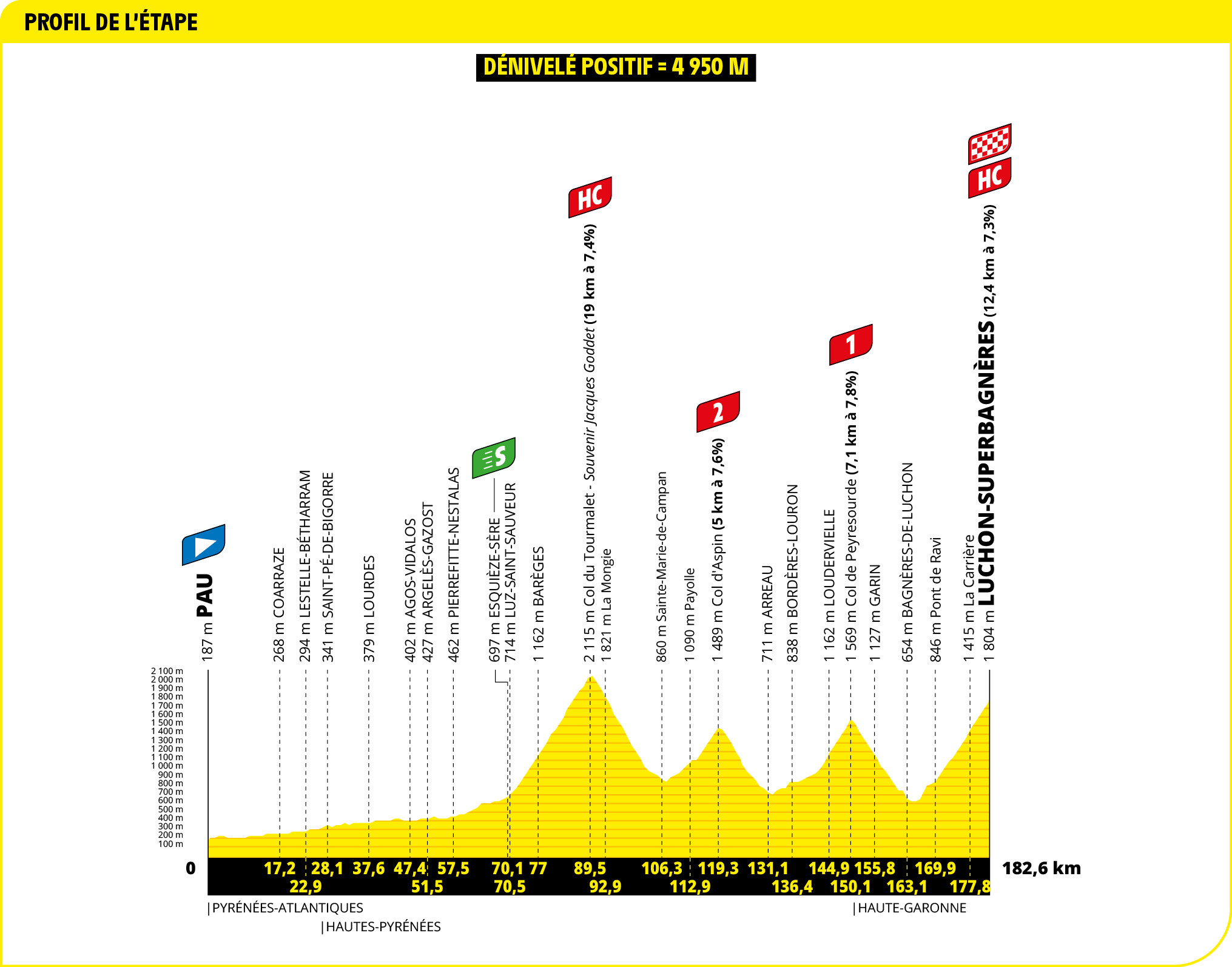 Zlom nastane približne na 70. kilometri, kde začína legendárne stúpanie na Col du Tourmalet (19 km / 7,4 %). Tento ikonický priesmyk sa v itinerári Tour objaví už tretí rok po sebe a jazdec, ktorý ako prvý prejde cez vrchol, získa Cenu Jacquesa Goddeta.