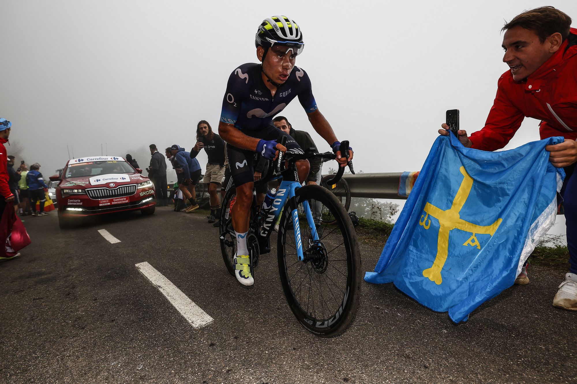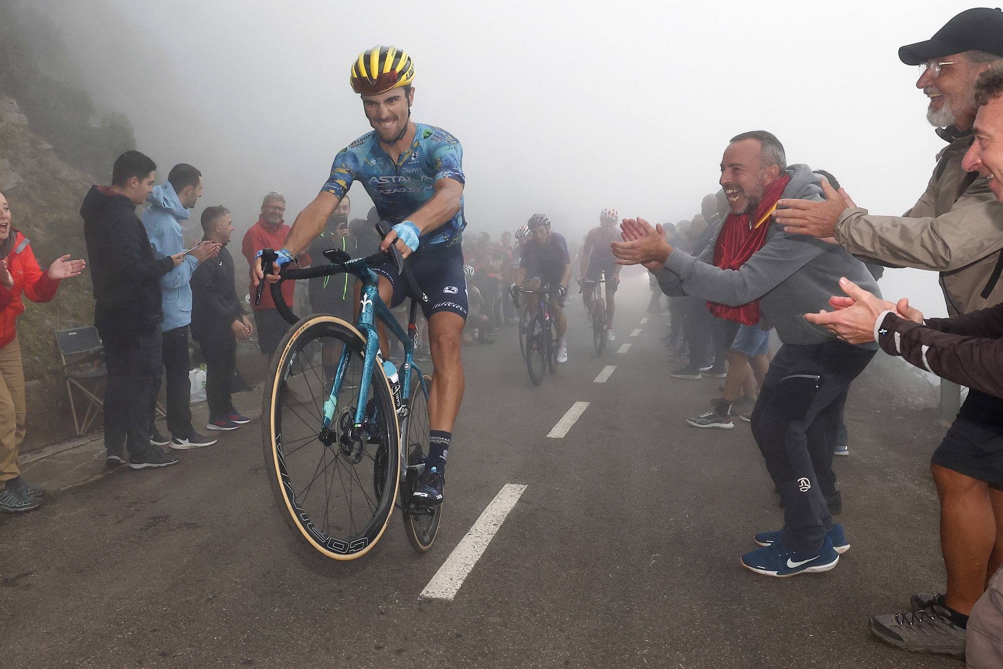 V hmlistých horách Astúrie sa úzka cesta dvíha tak strmo, že jej svahy nezvládli v minulosti ani sprievodné autá. Fanúšikovia vytvárajú hlučný koridor a povzbudzujú pretekárov, ktorí sa šplhajú po úsekoch so sklonom až 23 percent.