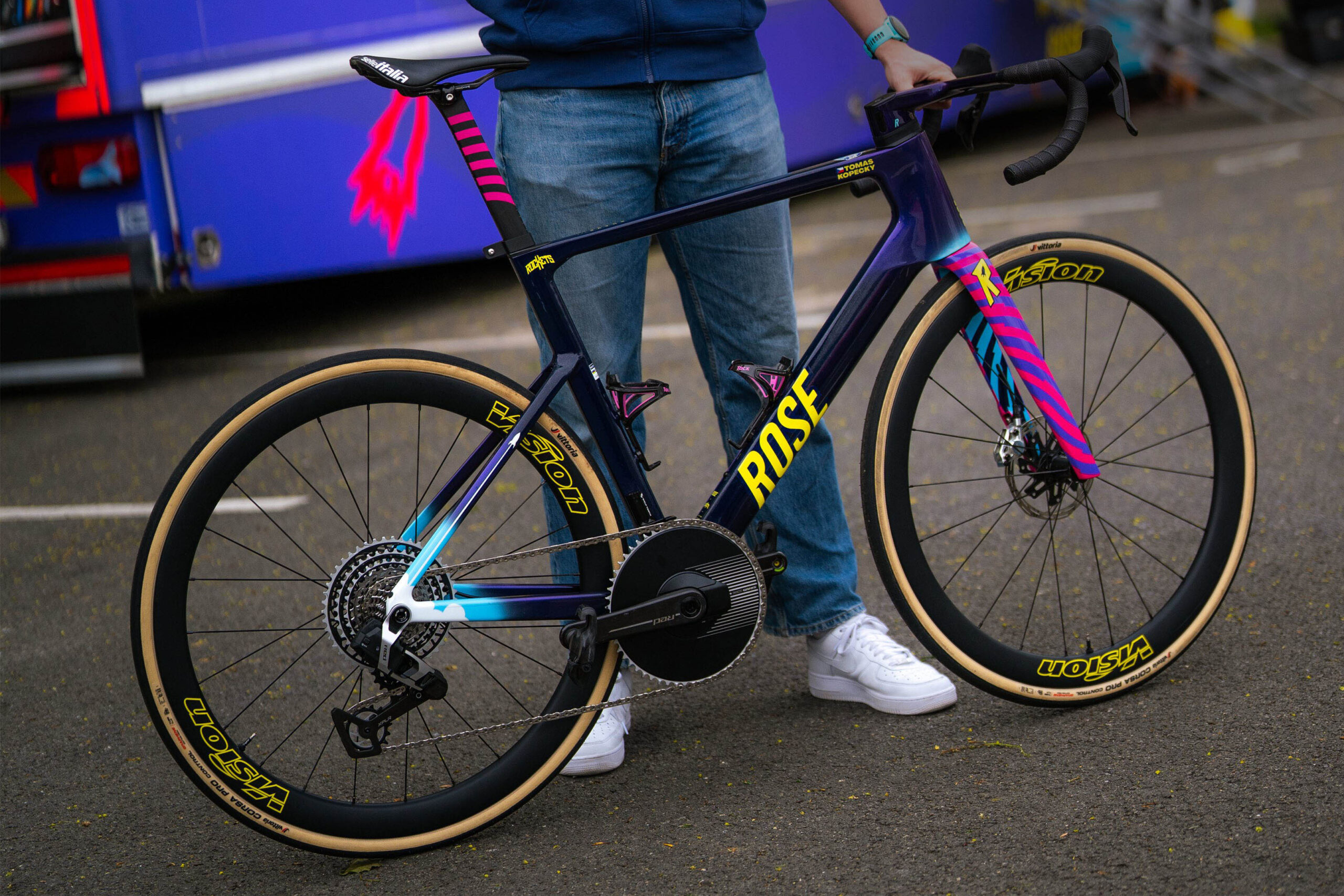Na kolesách Vision sú obuté plášte Vittoria Corsa Pro so šírkou 32 mm, čo je o niečo viac než ich bežný štandard, pričom práve šírka a tlak patria medzi najdiskutovanejšie parametre pred každým ročníkom Roubaix.