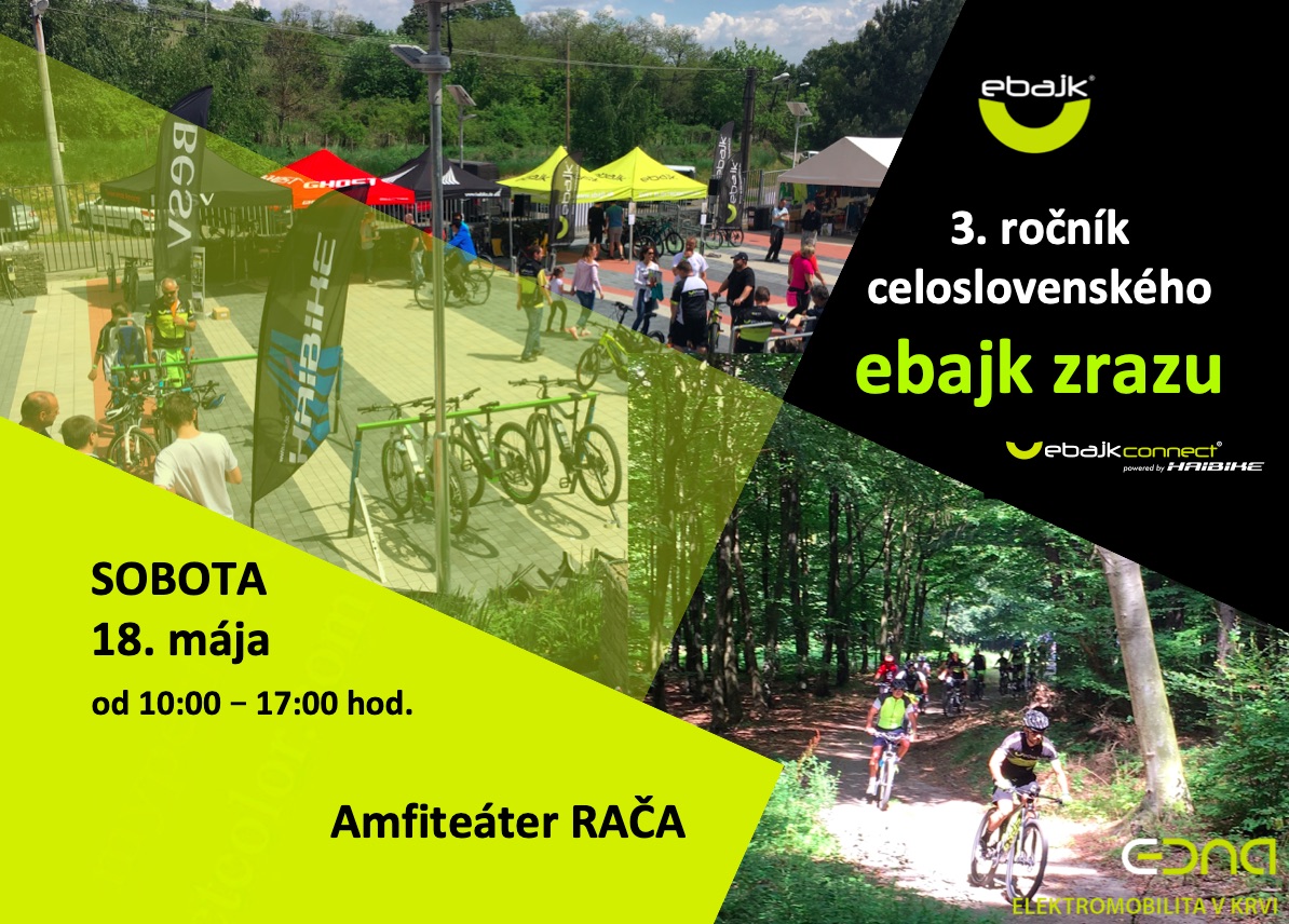 Už tretíkrát sa stretneme na tradičnom mieste – v Amfiteátri v bratislavskej Rači, aby sme oslávili všetkých ebajkerov a ich koníček. V sobotu od 10:00 budú pre Vás pripravené organizované výjazdy po ľahších či ťažších terénoch, novinky zo sveta elektrobicyklov či doplnkov. Zarezervujte si termín 18. 5. 2019 vo svojom kalendári.