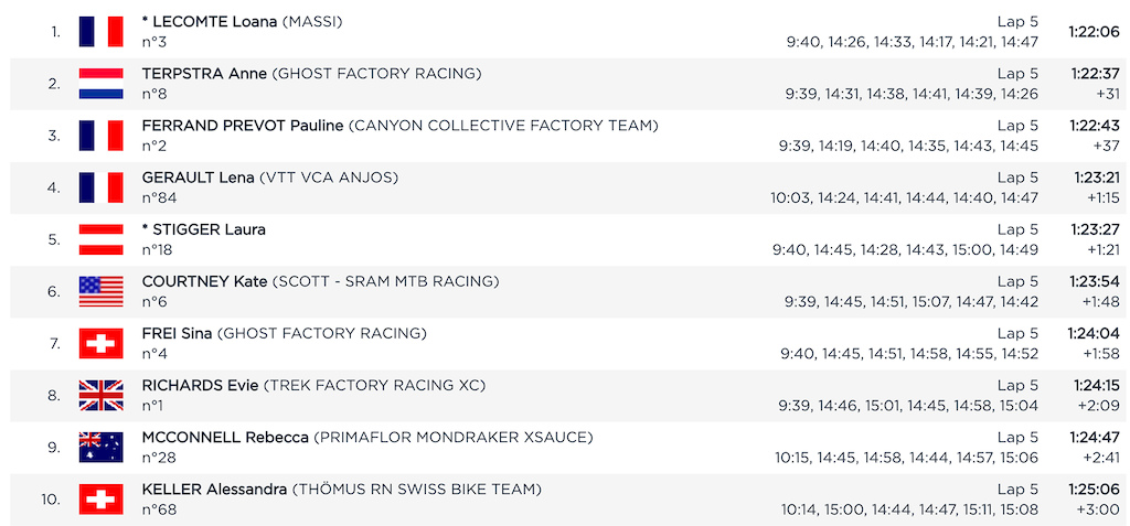 Kategóriu žien i mužov ovládla mladá generácia pretekárov. V ženách zvíťazila iba 21-ročná Francúzka Loana Lecomte z tímu Massi Bikes. Na druhom mieste skončila s 31-sekundovou stratou Anne Terpstra a tretia prišla do cieľa súčasná majsterka sveta Pauline Ferrand Prevot so stratou 37 sekúnd.