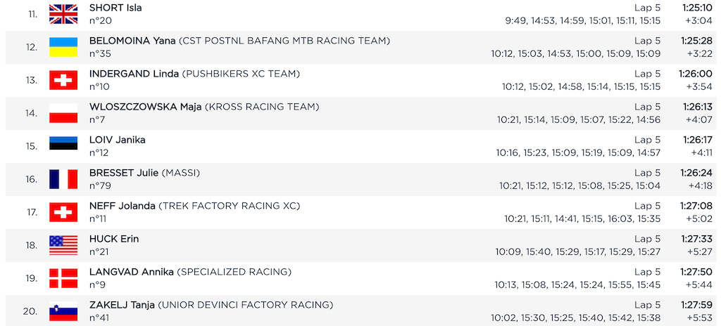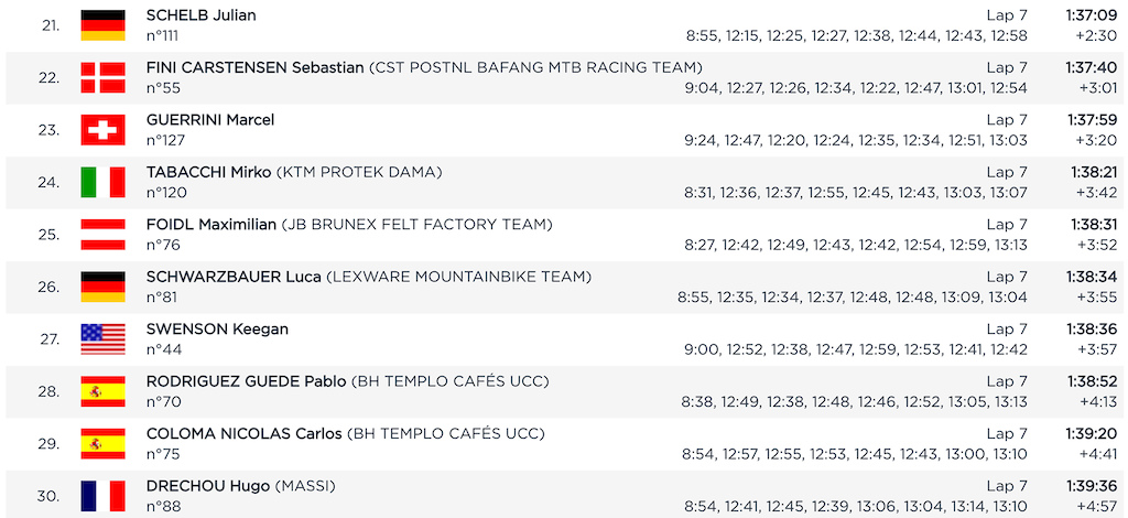 Majster sveta a veľký favorit na víťaza Nino Schurter sa v úvode trápil a stratil veľa času na vedúcu skupinu jazdcov, ale v posledných dvoch kolách sa mu podarilo stratu dobehnúť a obdivuhodným výknom vybojoval štvrté miesto v špurte s Henriquem Avancinim.
