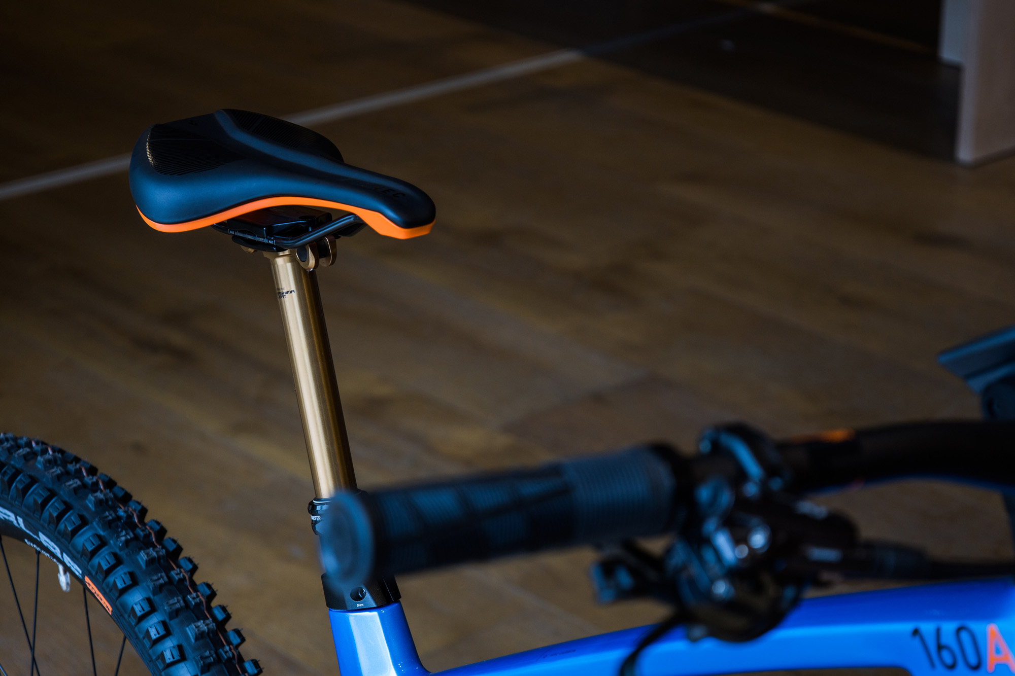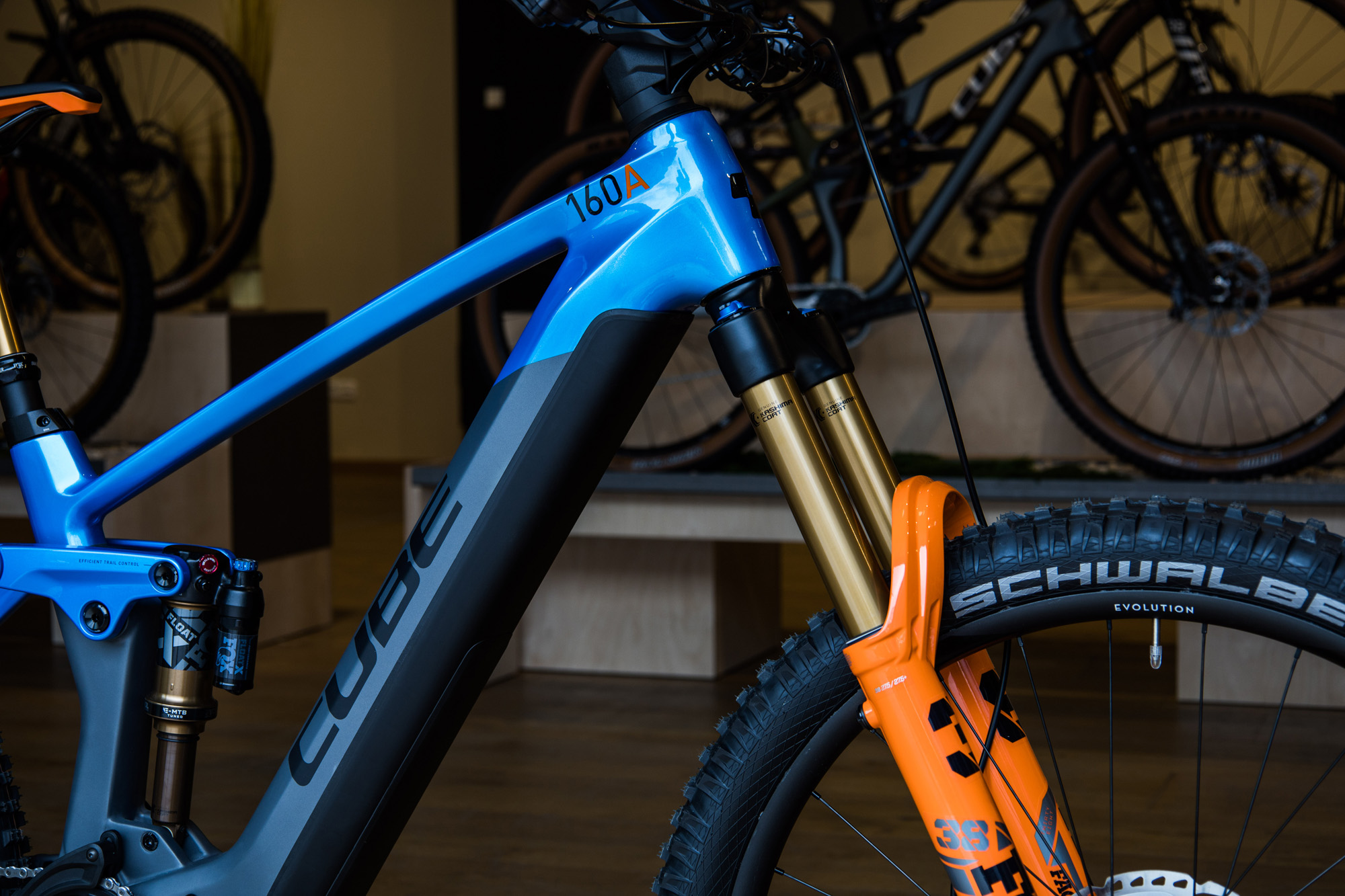 Cube Stereo Hybrid 160 HPC Actionteam má vo výbave oranžový pretekársky špeciál od Foxu – vidlicu Fox 38 Float Factory FIT4, ktorú vzadu dopĺňa tlmič Fox Float X Factory.