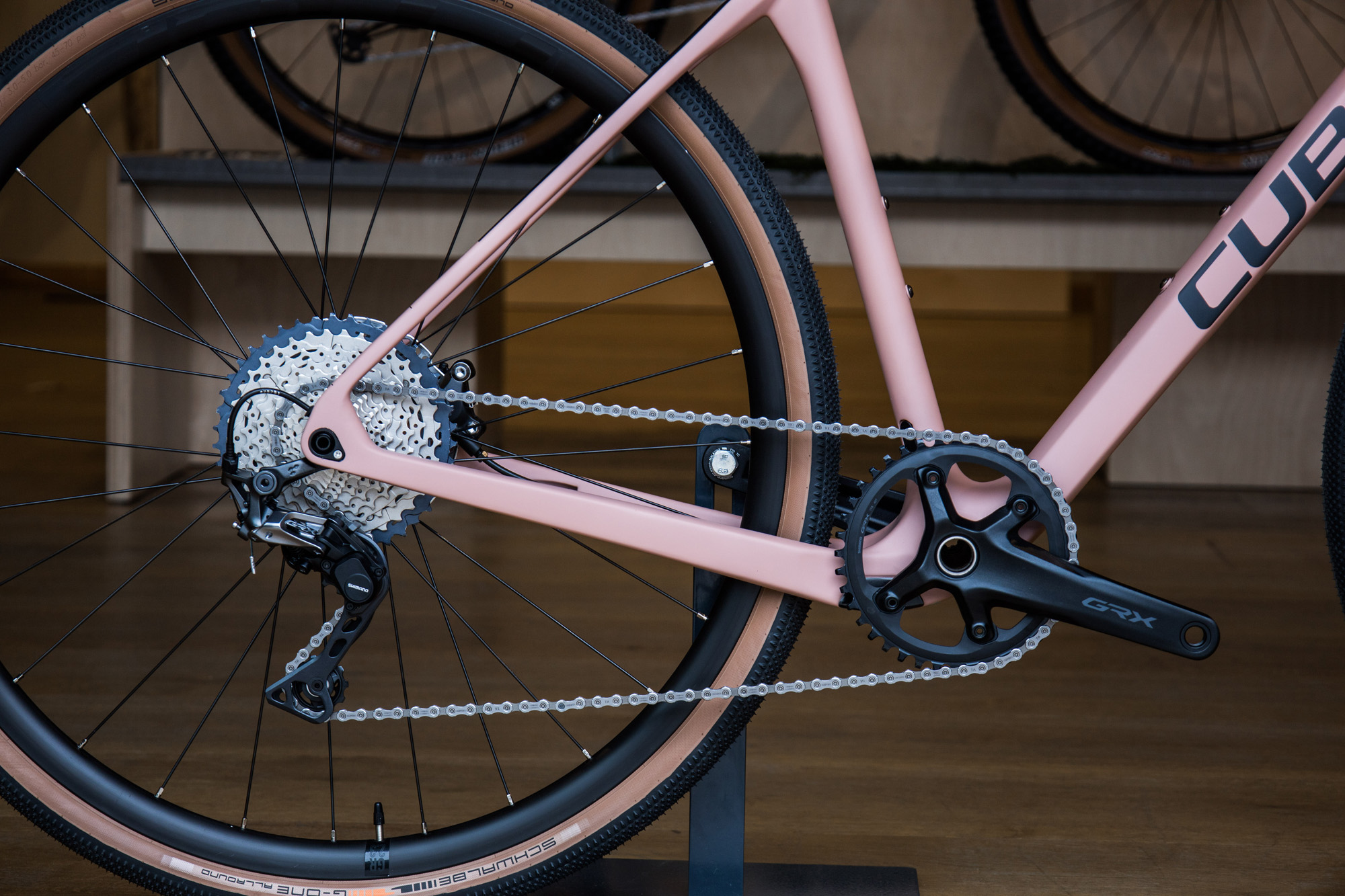 Radenie a brzdy sú z gravel sady Shimano GRX a kazeta SLX má rozsah 11-42 zubov. Celý bicykel váži 9,5kg a ak by ste chceli z tejto hmotnosti ubrať, bolo by najlepšie vymeniť kolesá Cube GR 2.3.