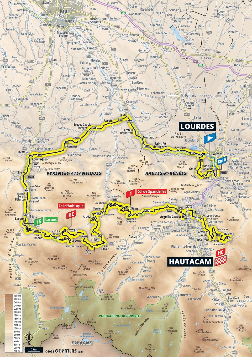 Spandelles je pravidelne strmé stúpanie s priemerom 8,3 %. Navyše z neho vedie ďalší dlhý zjazd. Cieľový kopec Hautacam začína 13,6 km pred cieľom a cyklisti budú finišovať vo výške 1 520 m. n. m.