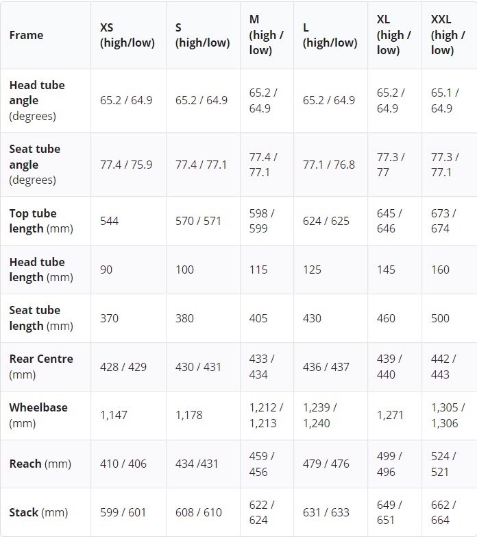 Hlavový uhol je 64,9 stupňa pri nízkom nastavení a 65,1 resp. 65,2 v tom vyššom.