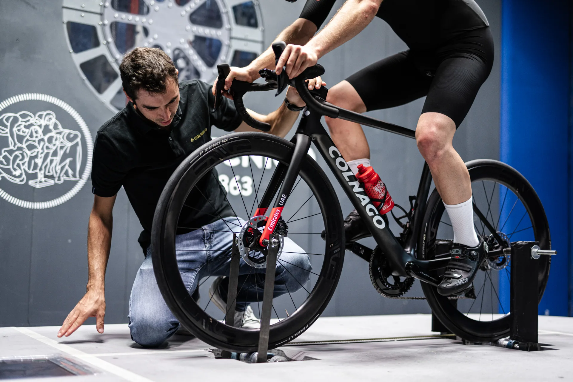 Pri testovaní mali namontovaný aj predný držiak na cyklopočítač i dva držiaky na fľaše s jednou fľašou, pretože Colnago hovorí, že takto vyzerá bicykel v záverečných fázach pretekov.
