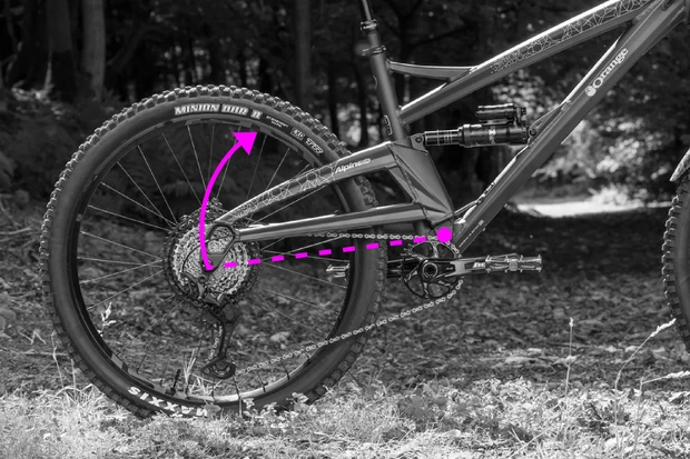 Na druhej strane rast vrchnej časti reťaze spôsobuje pedal kickback (spätný ráz pedálov). Pretože sa kazeta a ozubené koliesko pri pohybe zadného kolesa vzďaľujú od seba, kľuky sa pri stláčaní zavesenia „ťahajú“ späť.