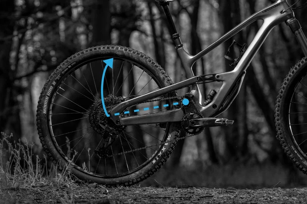 Keď sa zadné zavesenie s high-pivot stlačí a koleso sa pohybuje hore a dozadu pozdĺž svojej oblúkovej dráhy, efektívna dĺžka reťazovej vzpery bicykla – vzdialenosť medzi stredom stredovej konzoly a stredom osi zadného kolesa narastá.